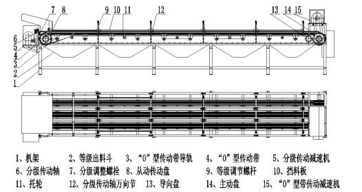 該分級機由機架、等級出料鬥、O”型傳動帶導軌、O”型傳動帶、分級傳動減速機、分級傳動軸、從動傳動盤、擋料板、托輪、分級傳動軸萬向節、導向盤、主動盤、“O”型帶傳動減速機等部分組成。該機工作原理是利用O”型傳動帶與分級傳動軸之間的間隙對物料進行分級,物料離進料口越遠,“O”型傳動帶與分級傳動軸之間的間隙越大。同時由於分級傳動軸向“O”型傳動帶外一側轉動,使得水果360度旋轉,從而避免了因水果的不規則而導致的分級效果不佳的現象。