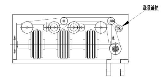 3、拆卸分級傳動減速機鏈條時,應先鬆開漲緊鏈輪中間軸的螺母(如下圖),使鏈條鬆馳後,再拆鏈條上的接頭。安裝時,還需要用漲緊鏈輪漲緊鏈條,但不要把鏈條漲得過緊!