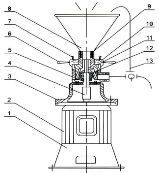 1、底座 2、電機 3、殼體 4、連軸器 5、機械密封 6、手柄 7、鎖緊螺絲 8、加料門 9、進料管道 10、調節盤 11、靜磨盤12、動磨盤 13、循環管