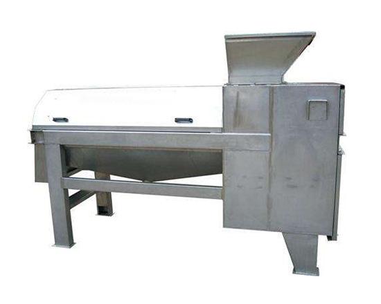 電機通過三角帶傳動,使轉子部件高速旋轉,水果由進料口進入機內,送料漿葉將物料螺旋輸送至去核棒,在去核棒的作用下,物料被搗爛。由於離心力的作用,物料中的汁液和肉質(已成漿狀)通過篩網上的篩孔進入下道工序,核則由出渣漿葉排出出渣口,從而實現漿渣自動分離。當果肉進入二道筒體內時,擋漿盤將物料均勻排發到刮板和篩網之間,由於刮板的回轉作用和導程角的存在,使物料沿著園筒向出口端移動,移動的軌跡呈螺旋狀,物料在刮板和篩網之間移動過程中受離心力的作用而被擦碎,汁液和肉質(已成漿狀)從篩孔通過進入下道工序,皮和籽等則從出渣鬥排出,從而達到自動分離的目的。