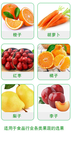 該機廣泛應用於外形類似圓形的果蔬原料的輸送過程中的檢果工序。該機機架由不鏽鋼型材焊接成形,滾杠部件由特種短軸不鏽鋼鏈條及不鏽鋼拋光無縫鋼管或PP塑料管而組成,具有設計合理、選果效率高、使用方便等特點。