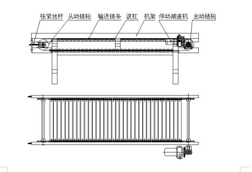 該機主要由機架、輸送鏈條、滾杠、主動鏈輪、從動鏈輪、傳動減速機等重要部件組成。