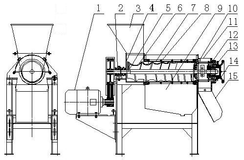 1、電機 2、軸承座 3、進料鬥 4、前支座 5、主軸 6、螺旋 7、過濾網 8、骨架 9、盛汁器 10、調壓頭 11、後支座 12、壓緊座 13、製動銷 14、手輪軸承座 15、出渣鬥